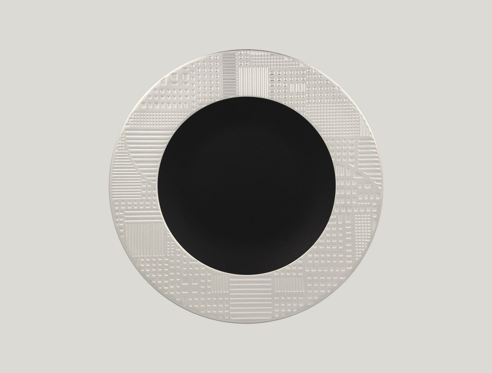 Porcelánový mělký talíř s reliéfem ve stříbrném dekoru a tajemně černým středem dodává vkusnou a elegantní atmosféru. Vaše hosty ohromí, zaujme a zpříjemní jim gastronomický zážitek. Prvotřídní porcelán zaručuje kromě svého atraktivního designu také svou odolnost a kvalitní zpracování.Mělký talíř
