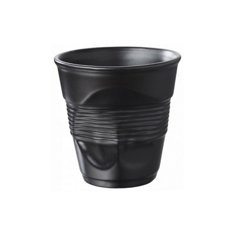 Froissés pohárek patří mezi nejúspěšnější kousky porcelánu Revol. Jeho nevšední design zaujme každého na první pohled a využijete ho všude, kde si vzpomenete. V tomto praktickém hrnečku v troubě upečete muffiny, suflé nebo jiné moučníky, v mrazáku v něm připravíte zmrzlinu nebo jiné mražené pokrmy a samozřejmě perfektně poslouží při servírování horkých i studených nápojů. Navíc se pyšní svou odolností a jednoduše čistí, protože kamarádí i s myčkou. Tento zmačkaný pohárek už jen tak neskončí v koši, ale vkusně ozdobí jakýkoliv interiér i obyčejné posezení u kávičky. Navíc ho můžete doplnit elegantním tácem s prolisy dělanými přímo na „Froissésky“, což více znásobí atmosféru.Pohárek 18 cl, černý saténový
