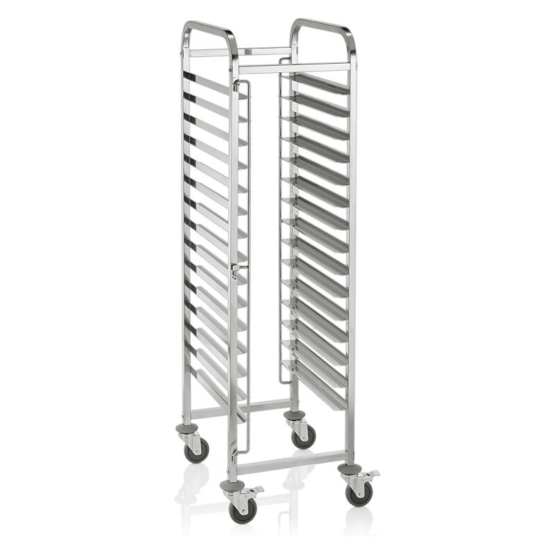 Tento regálový vozík se skvěle hodí pro převážení 15 táců. Má 4 otočná kolečka o průměru 12 cm s nárazníky, z toho 2 s brzdou a bezpečnostní pojistkou proti převrácení (zabraňují tak převrhnutí převážených nádob). Nerezová ocel zaručuje vysokou odolnost a díky této kvalitě zpracování se vozík vyznačuje dlouhou životností a vysokou zatížitelností.Vozík regálový 62 × 47 × 174 cm